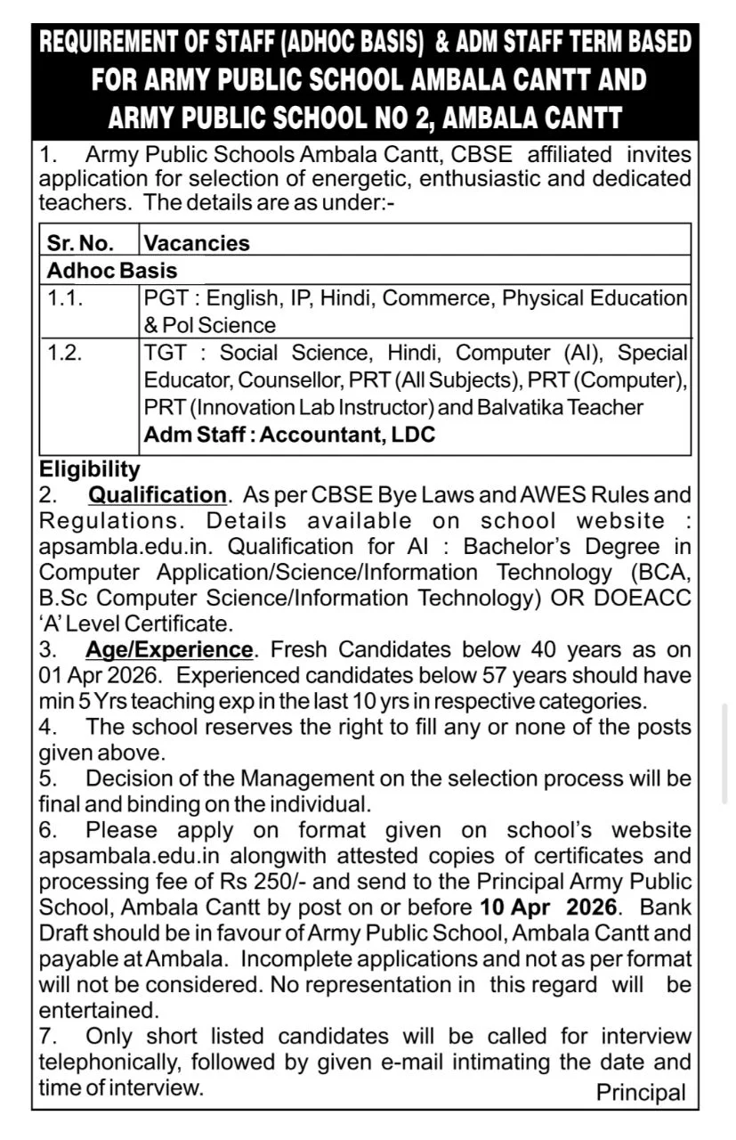Army Public School Ambala Cantt and Army Public School No. 2, Ambala Cantt, have released an employment notification inviting offline applications for the selection of energetic, enthusiastic, and dedicated teachers and administrative staff on an Adhoc and Term basis.